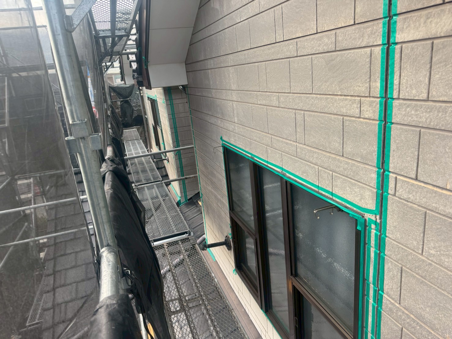 通常は既存のシーリングを撤去してからの養生となりますが、明日雨天予報法の為、目地からの雨水の侵入を防ぐ為にシーリング撤去を後回しにさせていただき、養生を先に行いました。