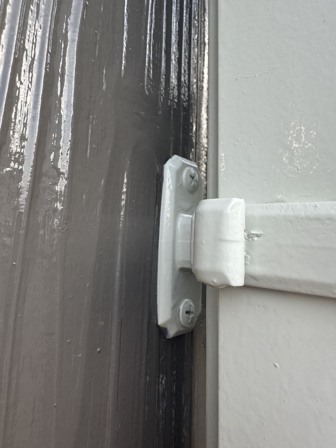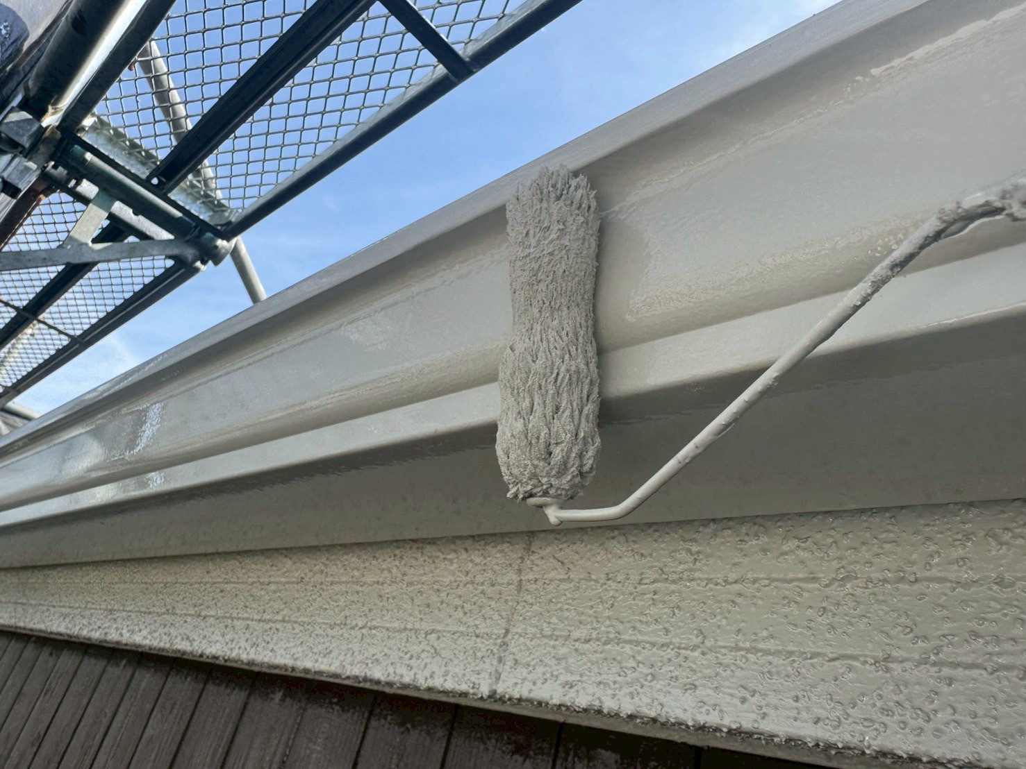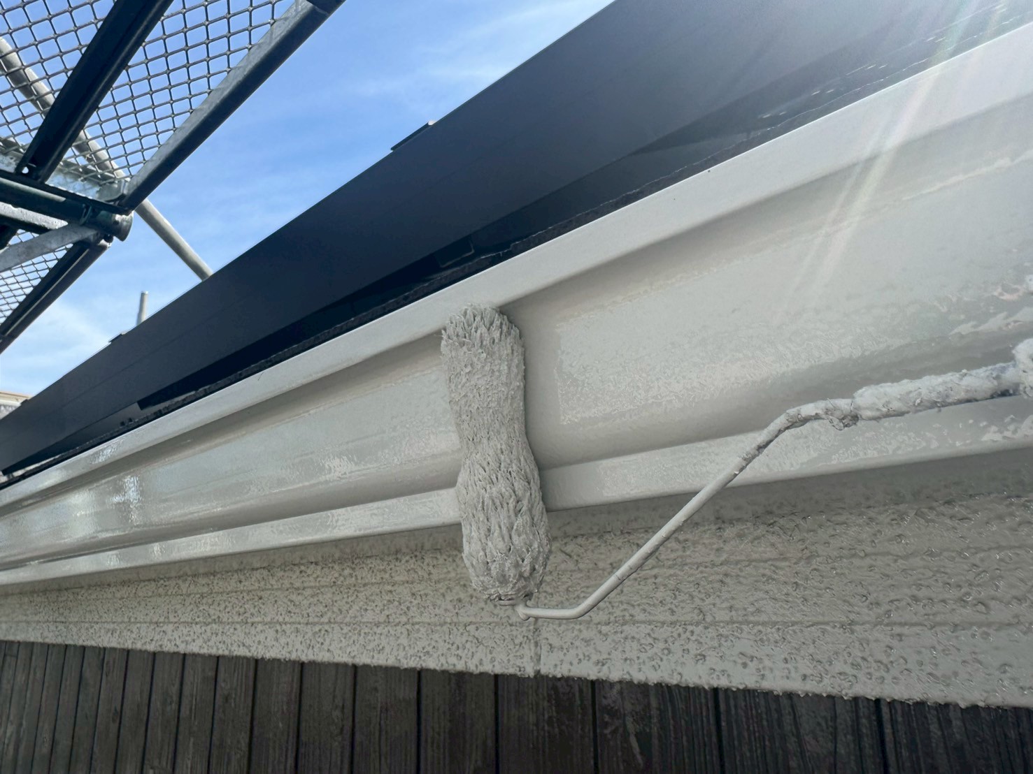 本日は、最終仕上げ工程として付帯部(雨樋・シャッターボックス)の上塗り塗装工程をおこないましたので、ご紹介させていただきます。