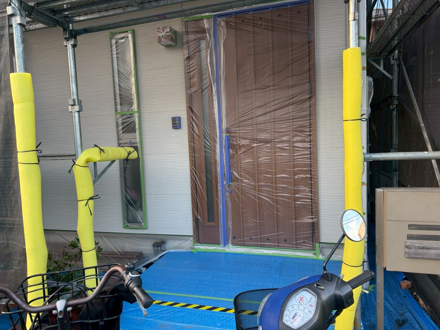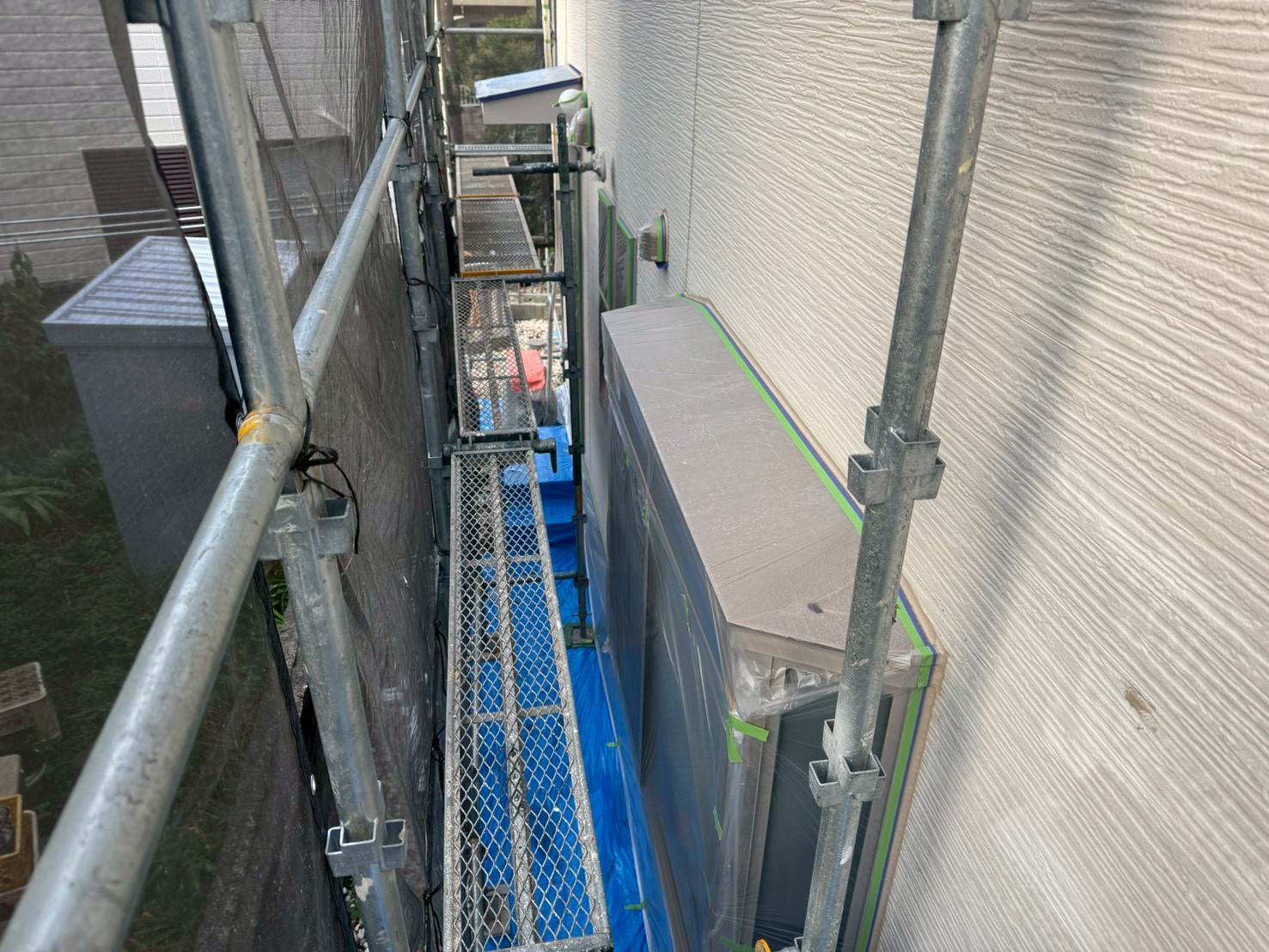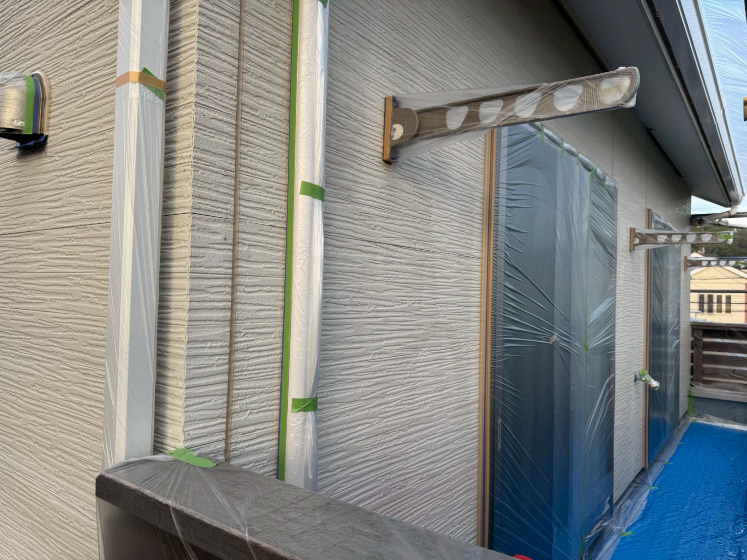 窓、玄関ドア、エアコン室外機、植物、物置、配線関係などの塗装をしない箇所に養生をおこない、塗料が付着するのを防ぐことを目的としております。