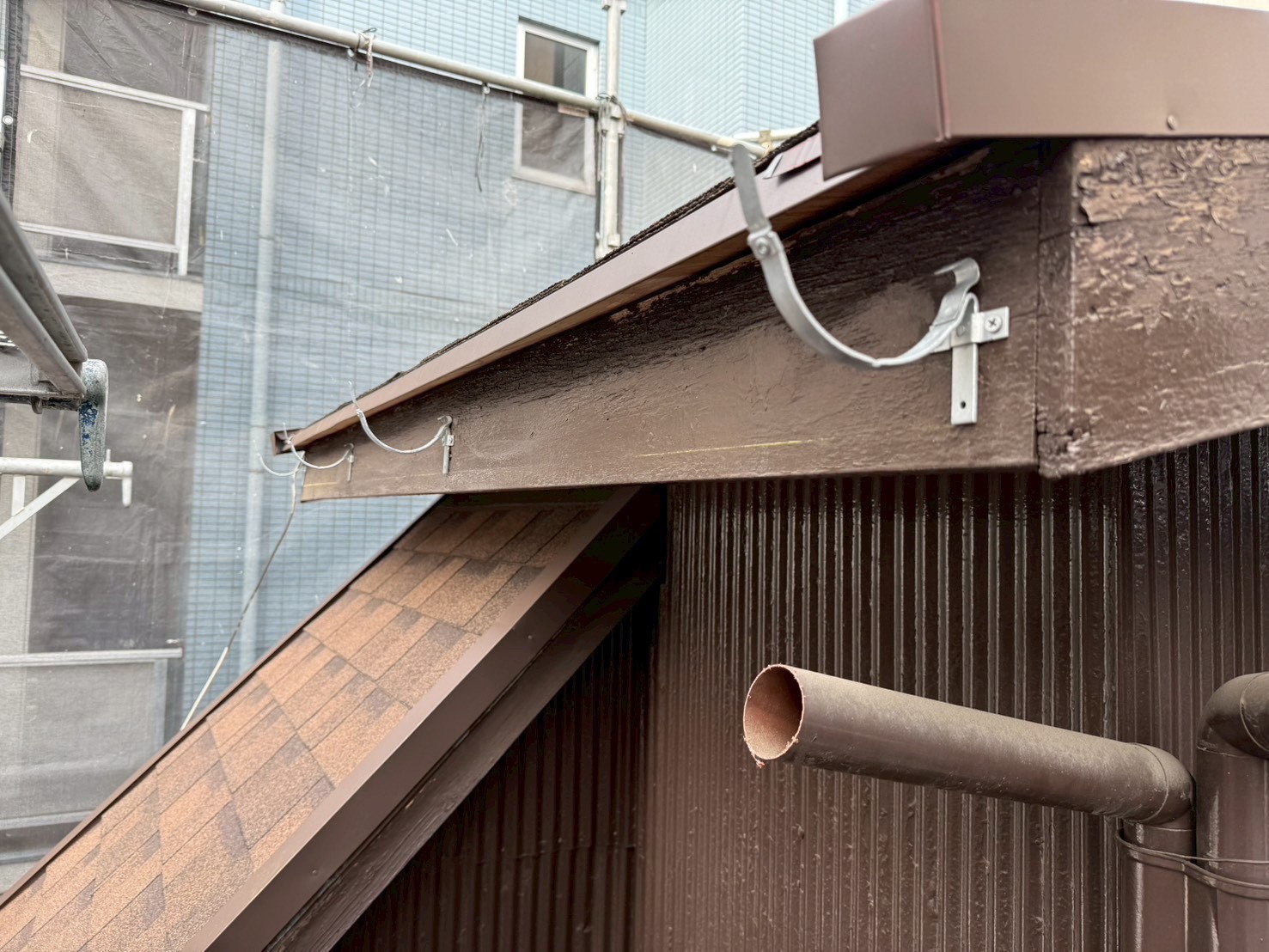 屋根の位置と水平を確認しながら雨樋金具を取り付けしていきます。
