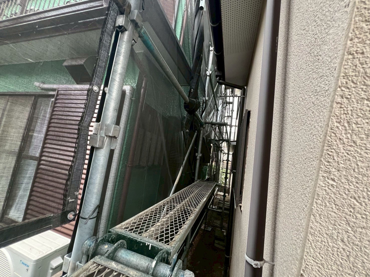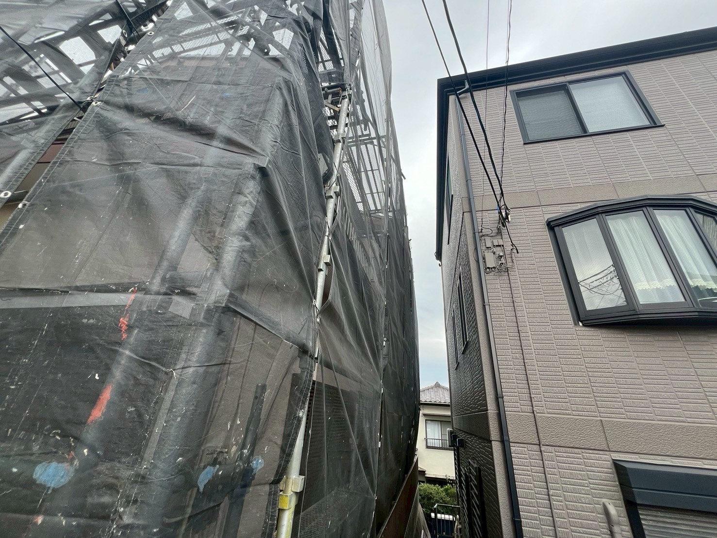 カラーシュミレーションや現場確認などもおこない、ついに本日無事に足場設置が完了です。