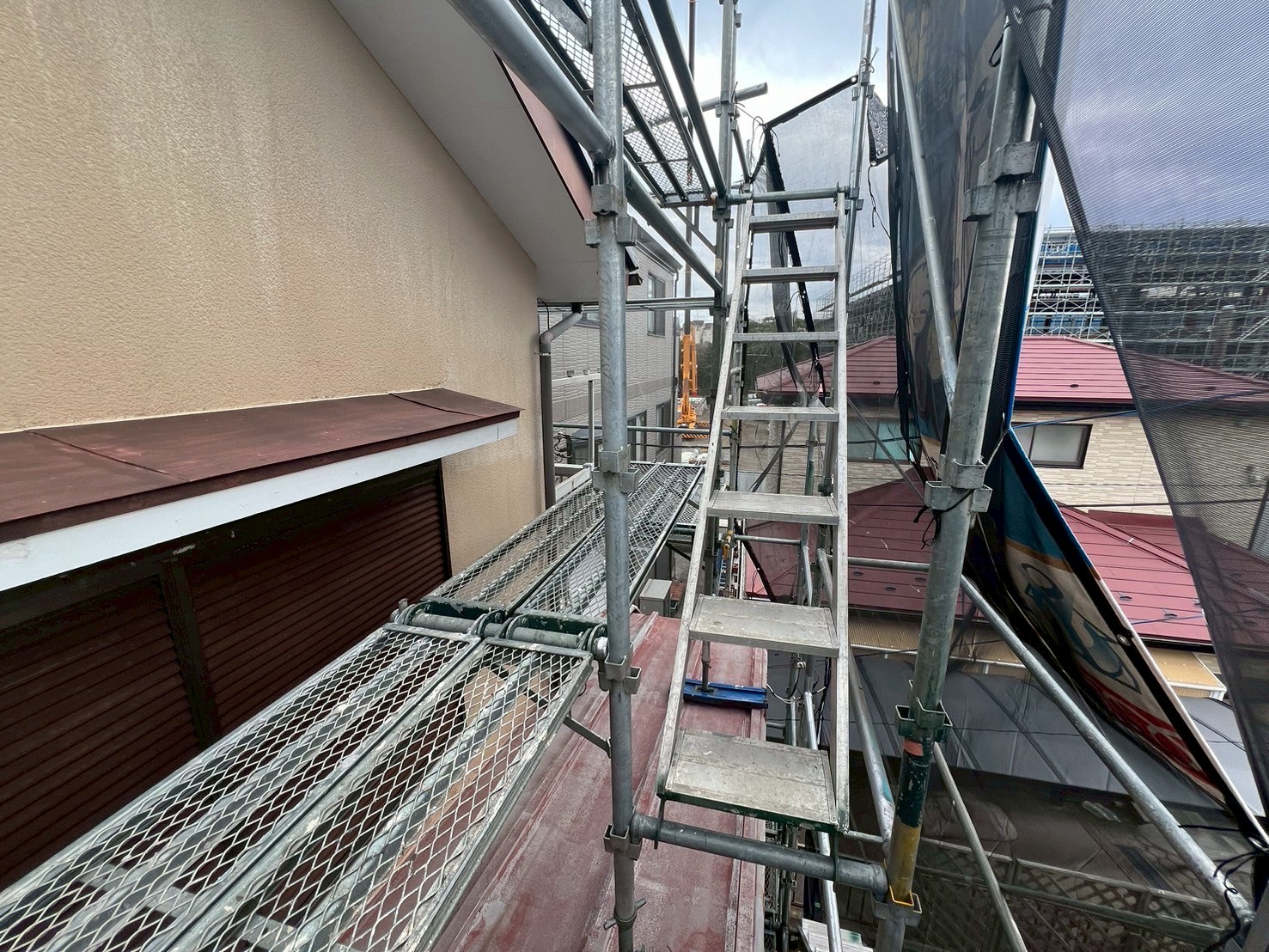 足場とは、外壁塗装や屋根工事などを施工するにあたり、高所作業を安全且つ効率的におこなう為の建物の周囲に設置する構造物となります。