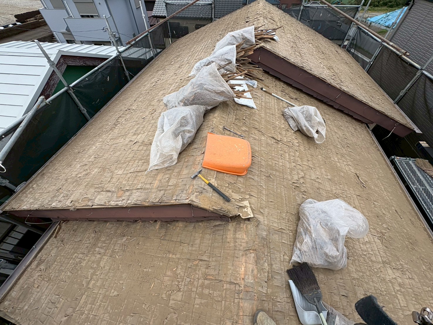 既存の屋根材を全て撤去し、新しい屋根材に交換する工事。