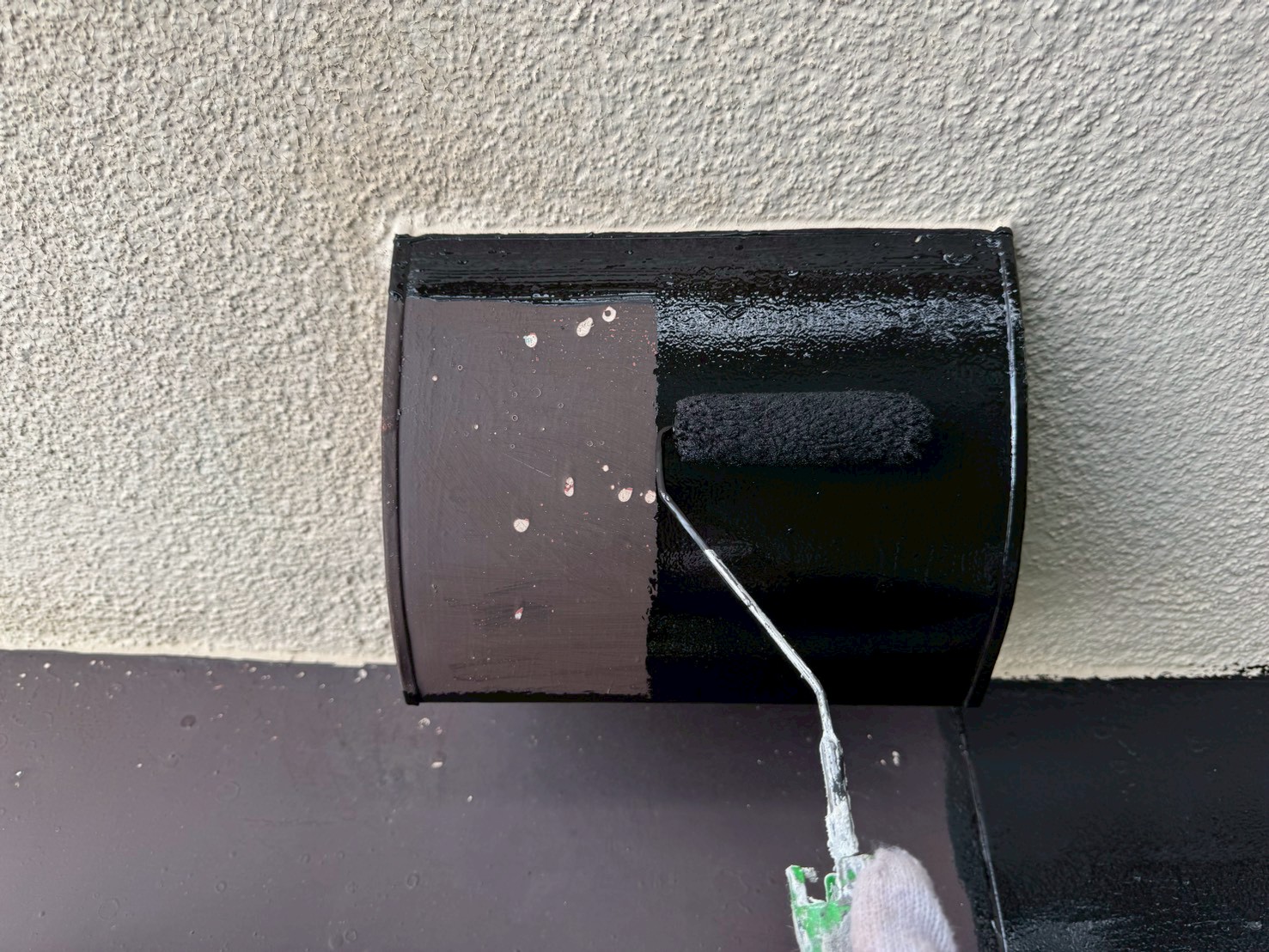 噴射式のスプレーガンではなく、刷毛やローラーを使い丁寧に手塗りにて下塗り施工をおこいました。
