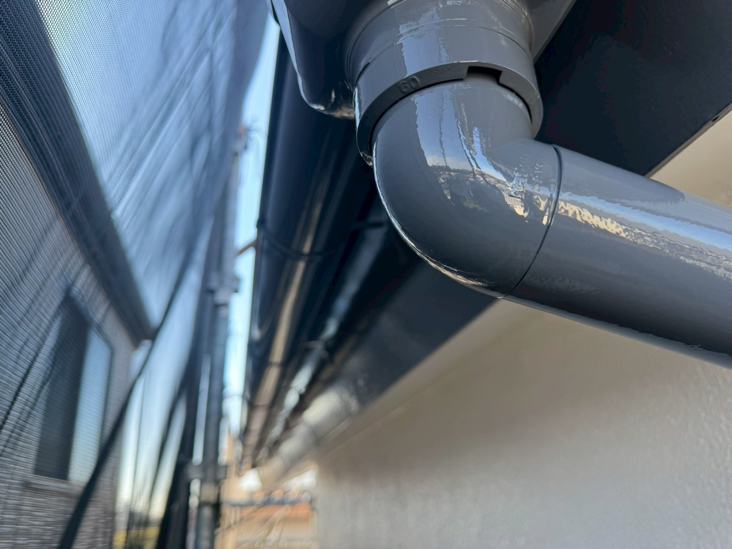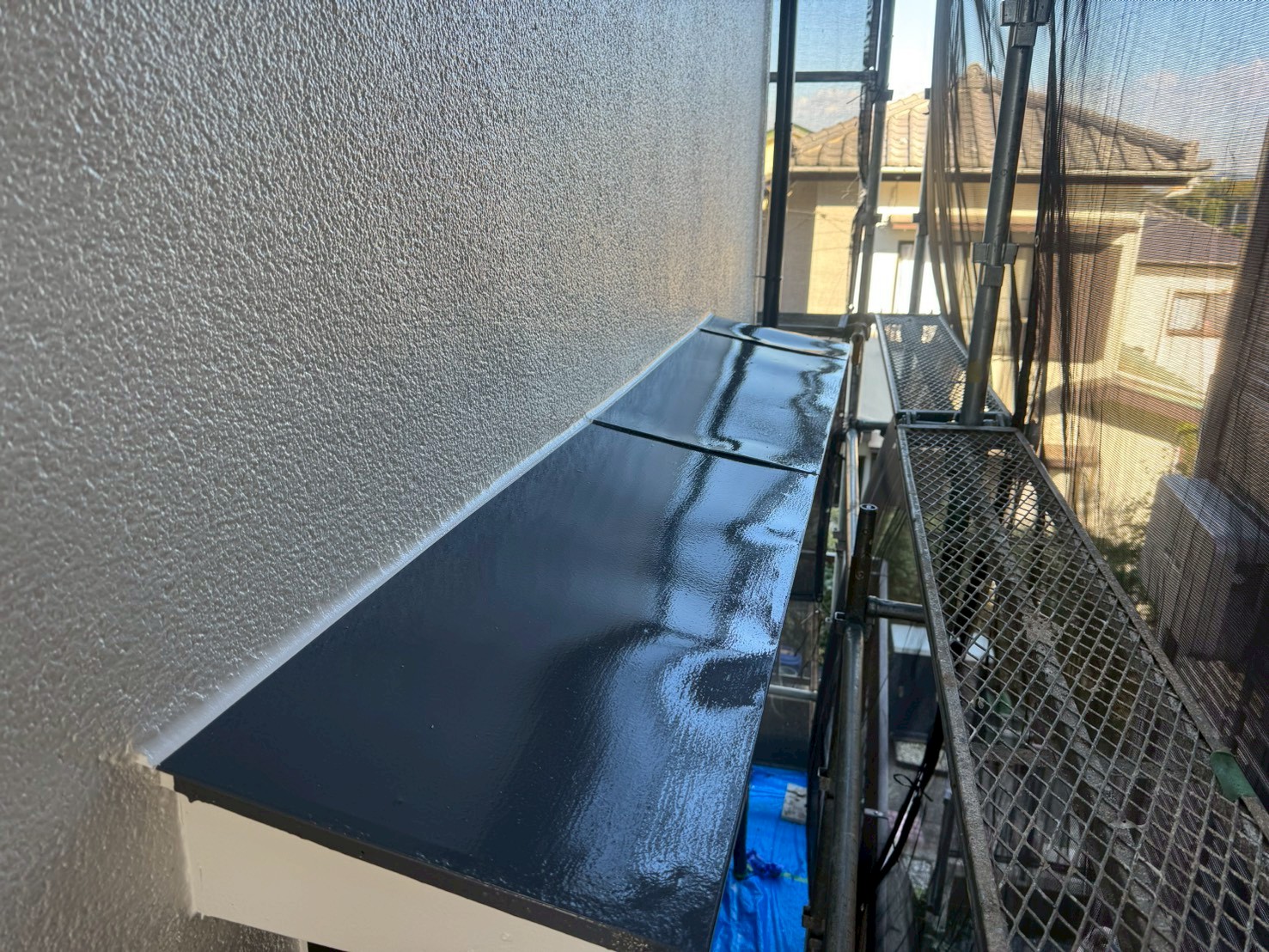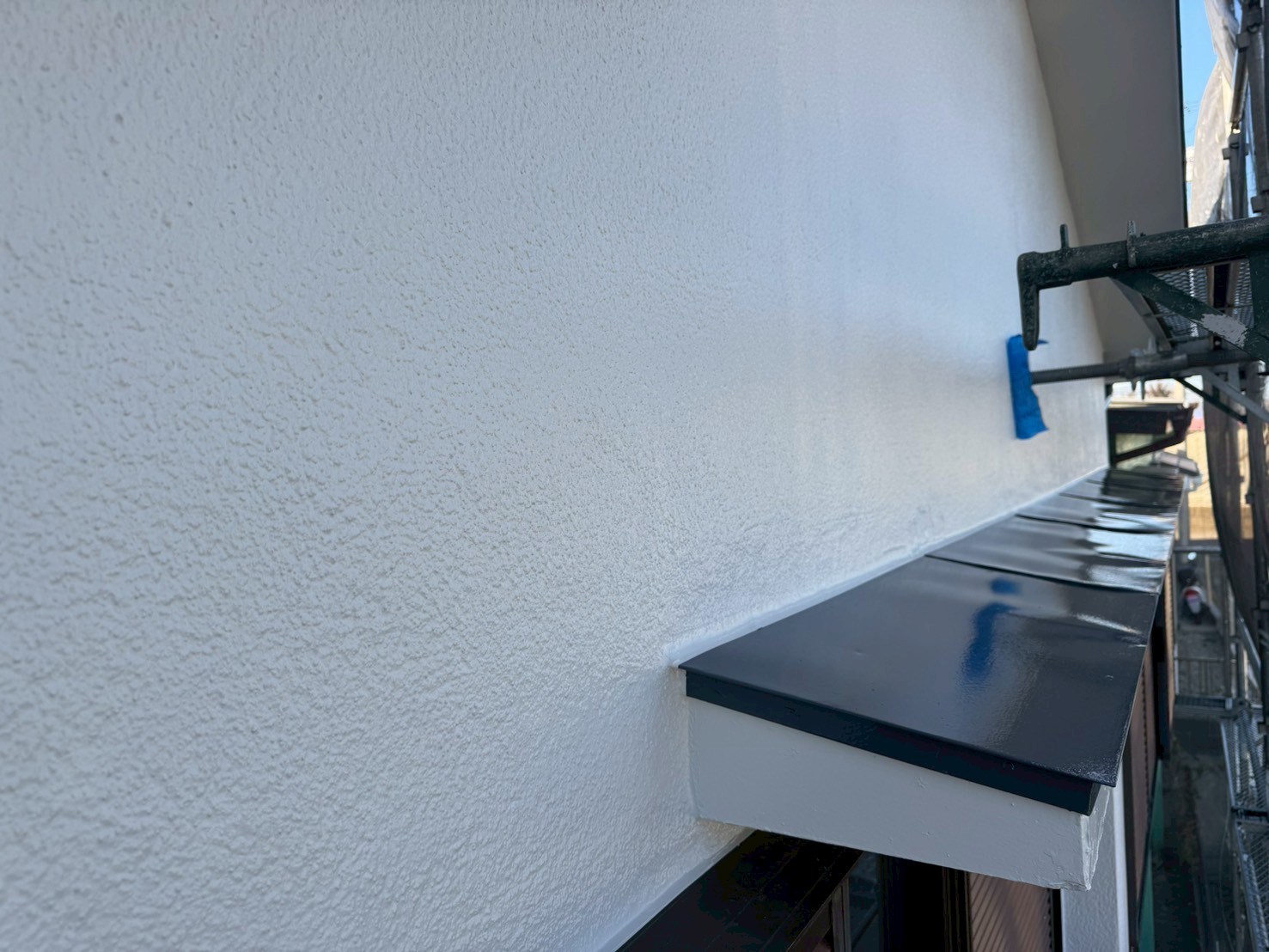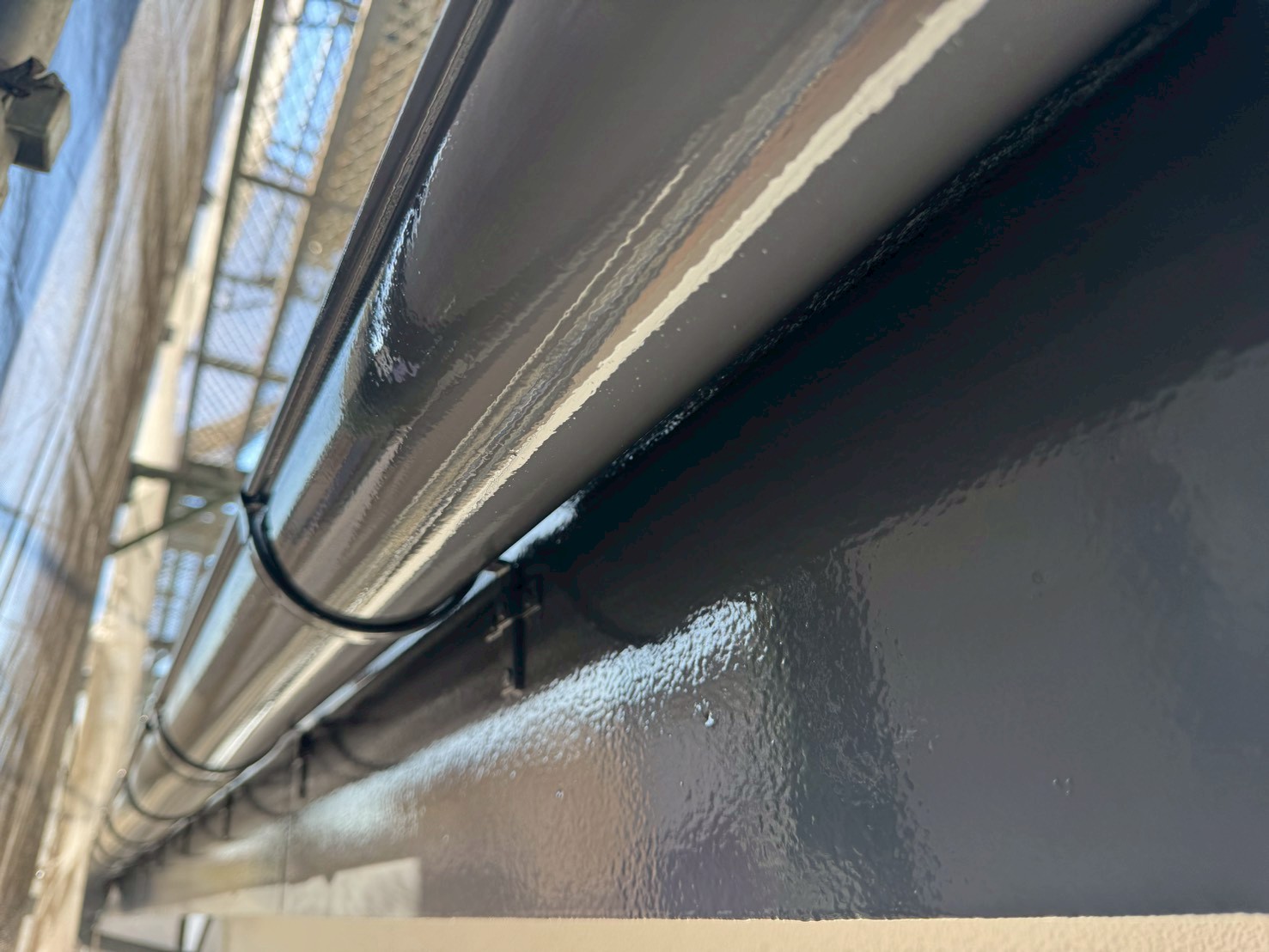 本日は【下屋根】【雨樋】【庇】【窓枠】【水切り板金】【破風板】の上塗りを実施いたしました。