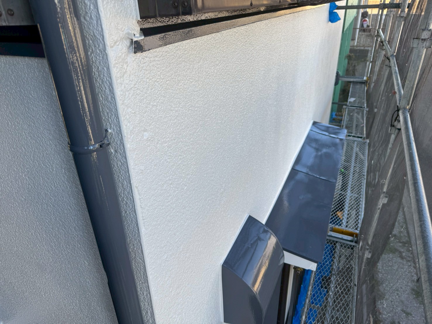 昨日、外壁塗装の上塗りが完了しましたので、最終仕上げの付帯部と下屋根の上塗り塗装を本日実施いたしました!!!