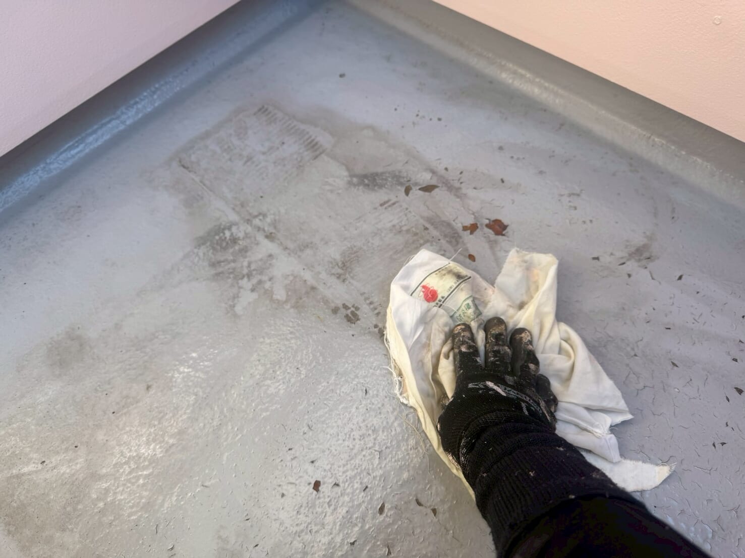 アセトン(有機溶剤)を含ませた布で表面の油膜などを除去する作業となります。
