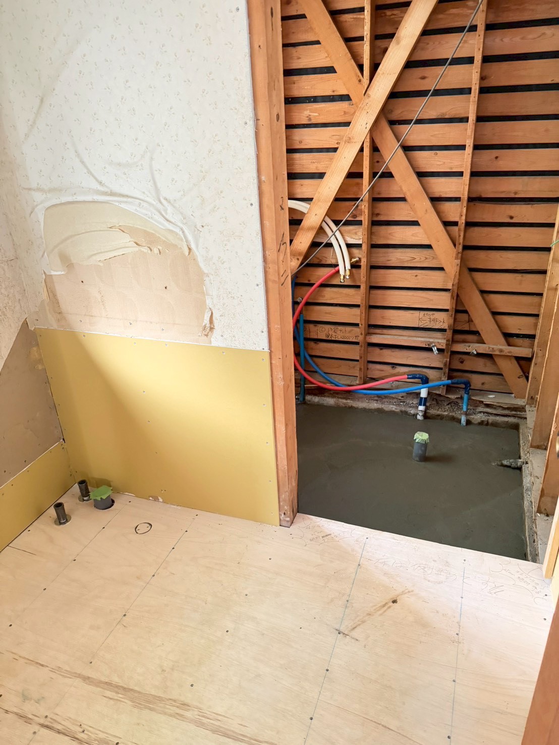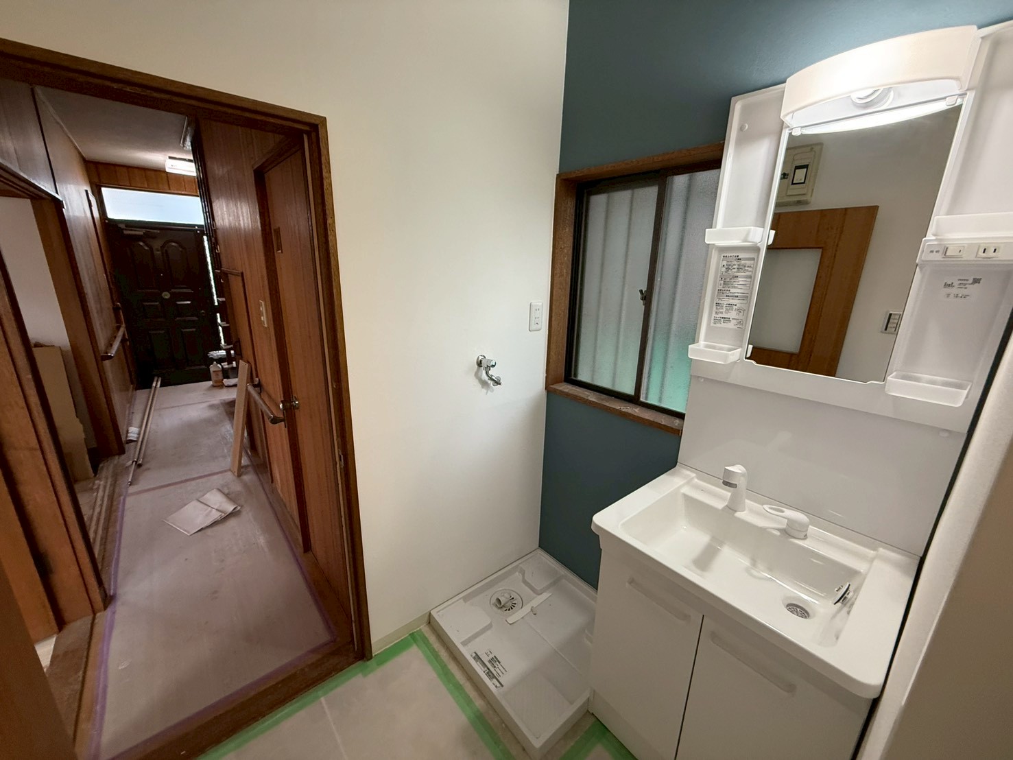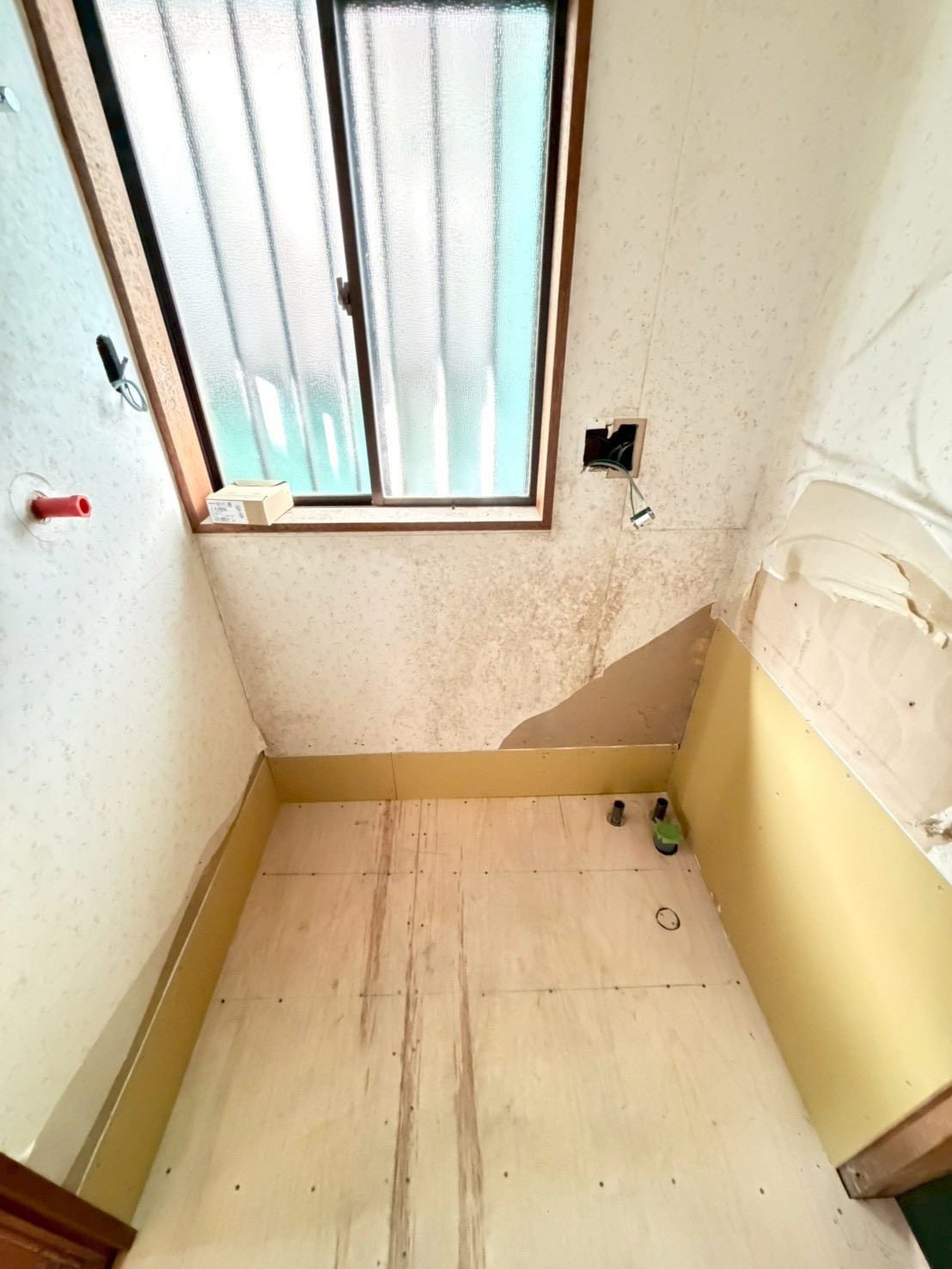洗面台位置変更に伴い、配管位置変更・床下地交換もおこないました。