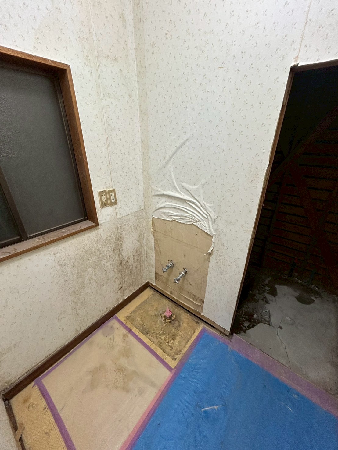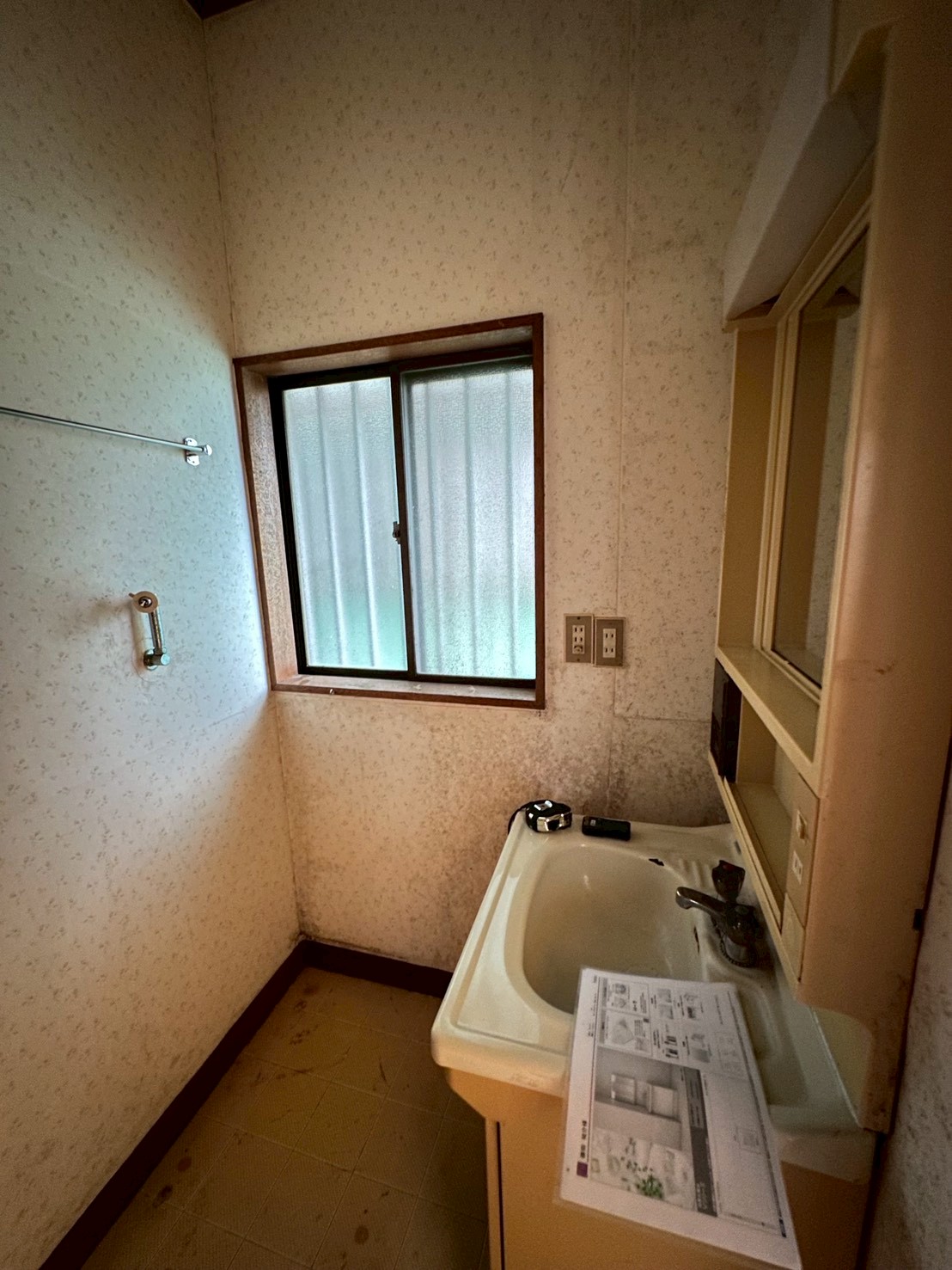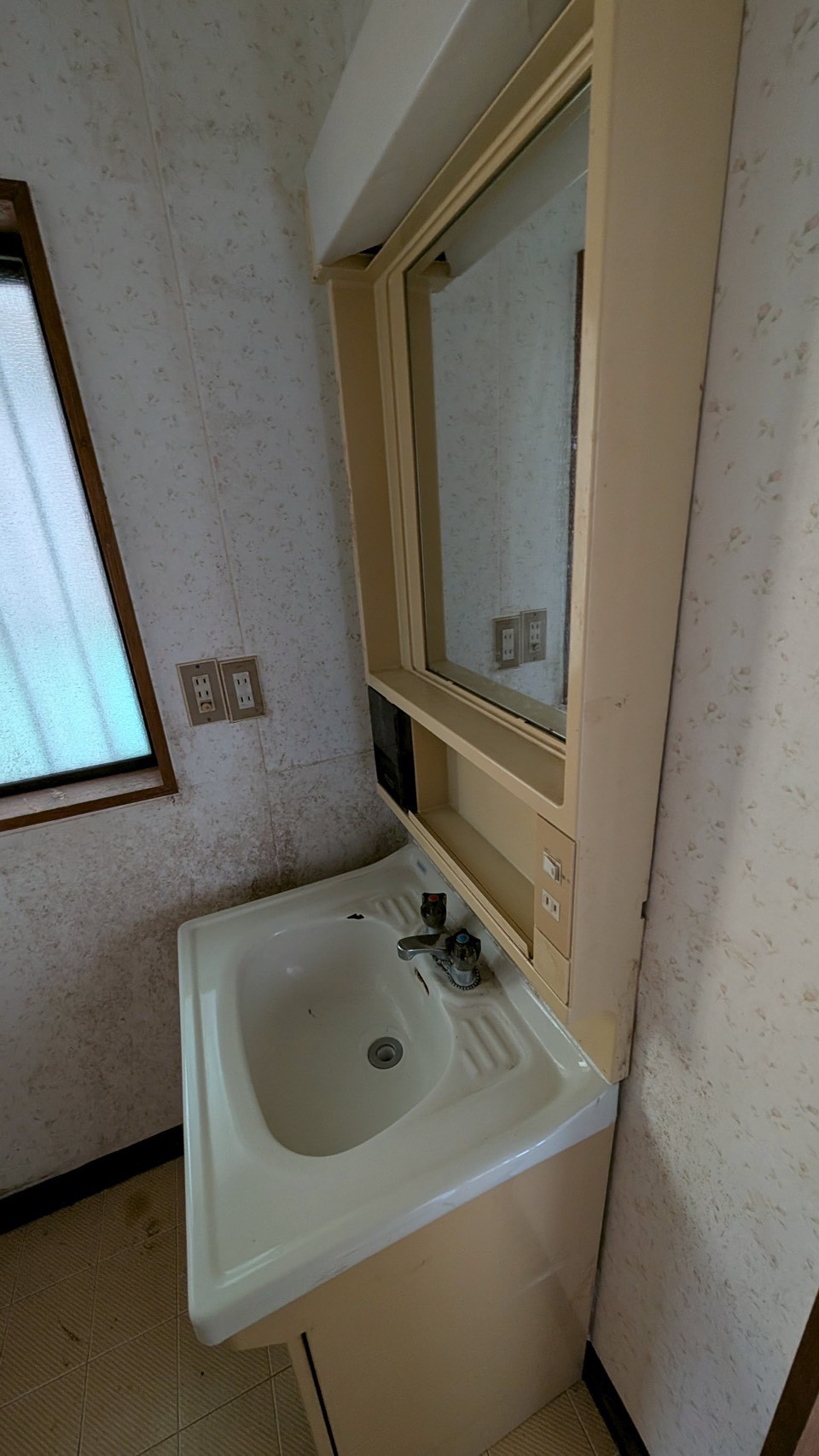 ご覧の通り洗面台は大変古く、クロスや床なども大変劣化が激しい状態でした・・・