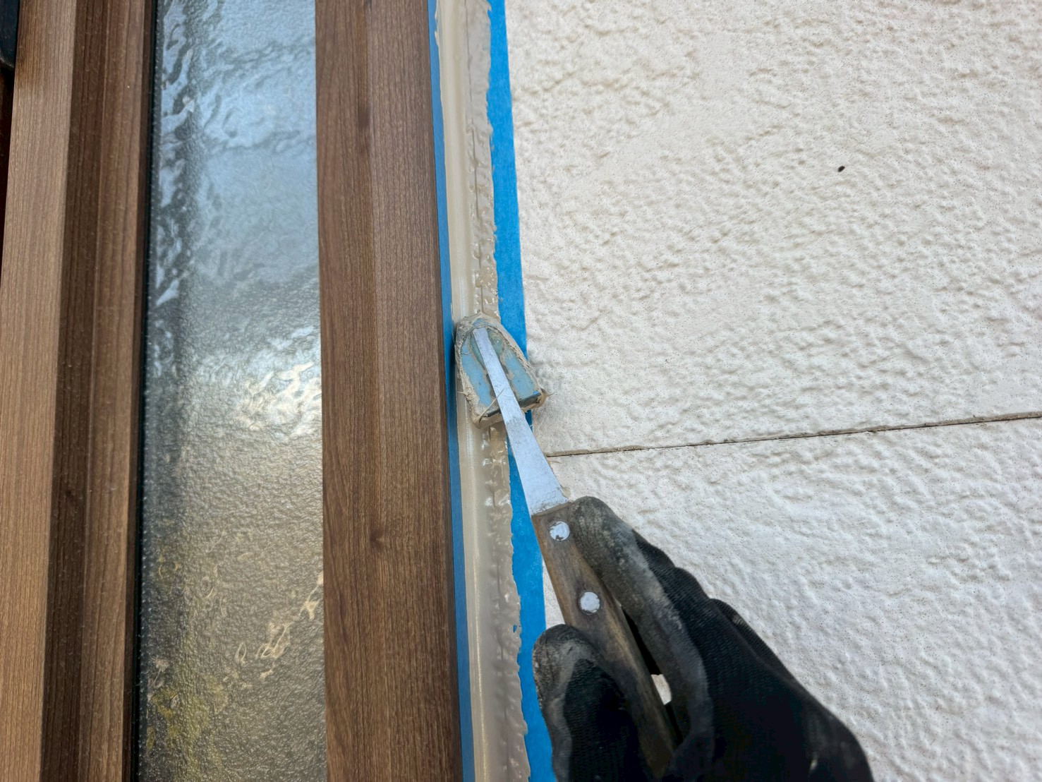 この抑えをする事により、シール表面が平になり内部にシーリング材もしっかりと行きわたります。