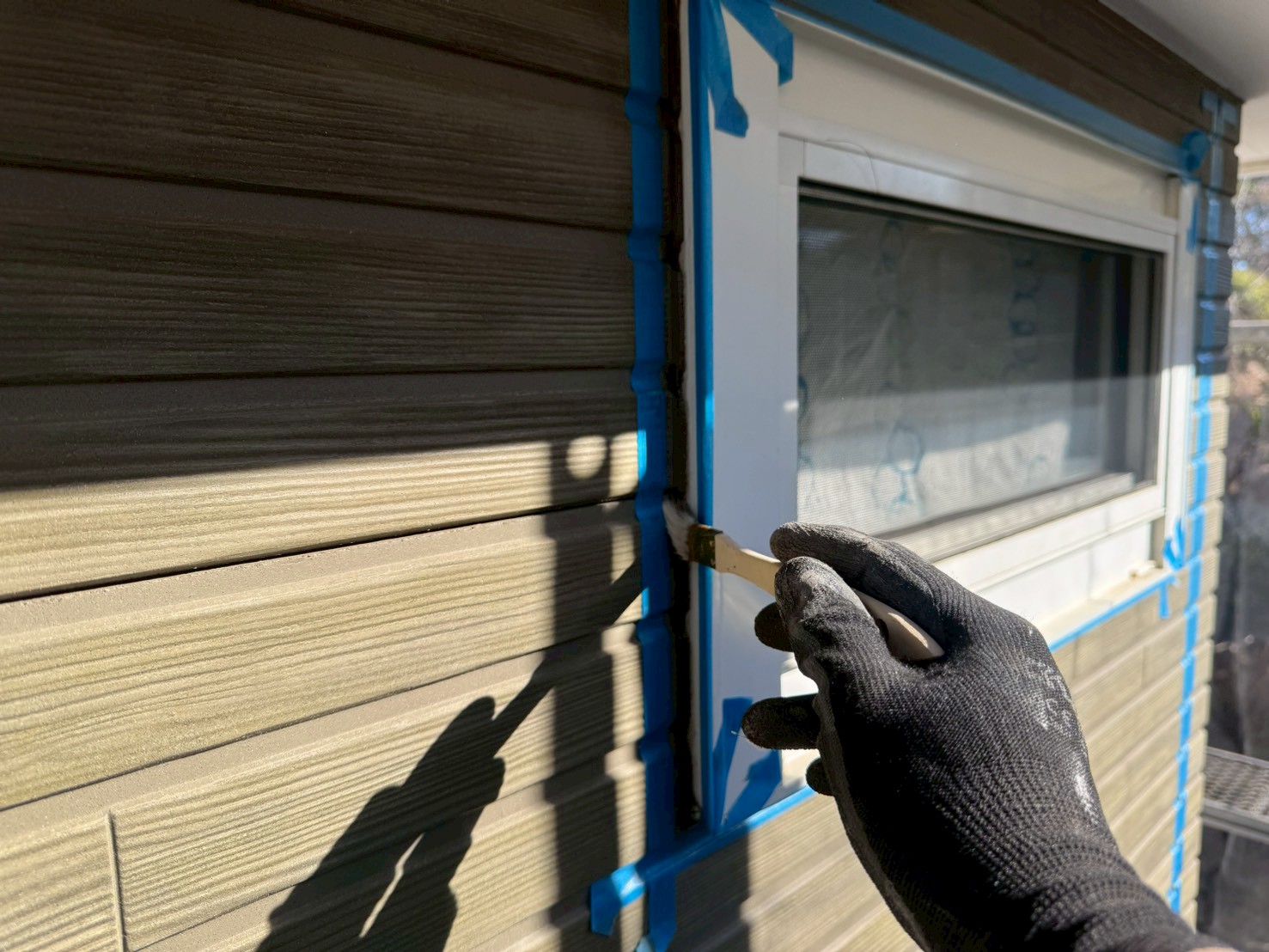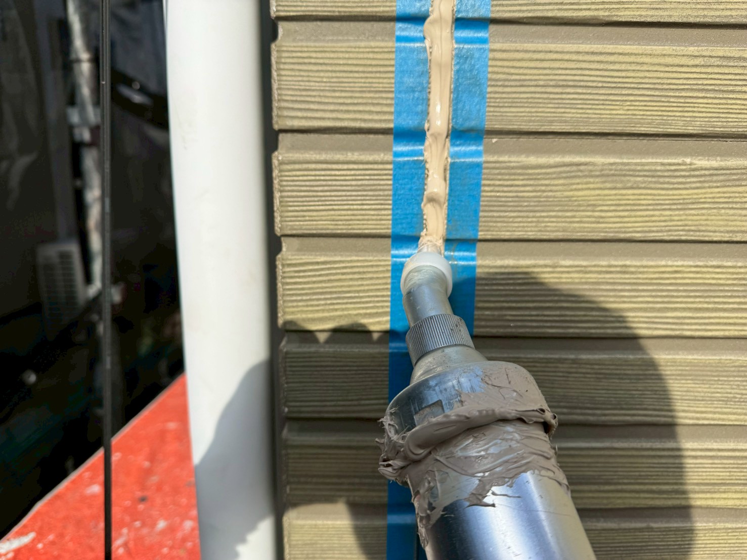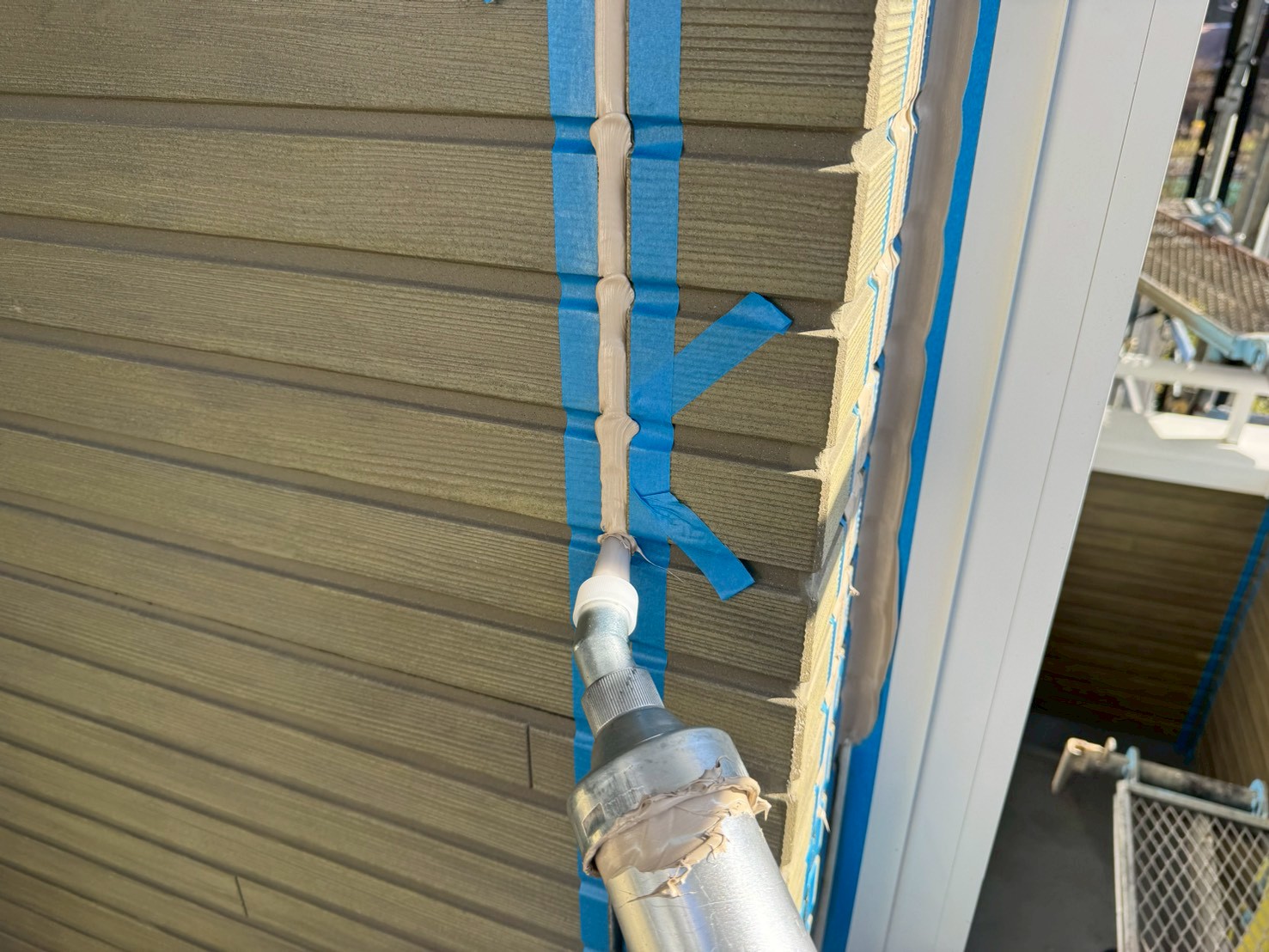今回の現場では、外壁塗装工事も同時におこないますので、この後の工程は付帯部の下塗り施工になります!