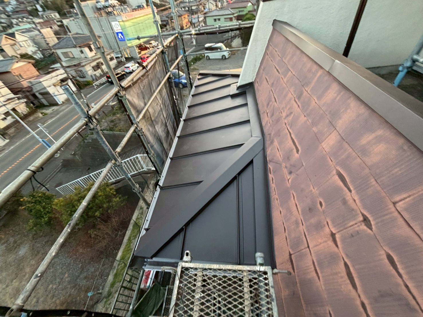 雨漏れの原因は【下屋根】【笠木板金】の著しい劣化でしたので、下屋根は葺き替え、笠木板金は交換、大屋根は塗装にてご提案させていただきました!