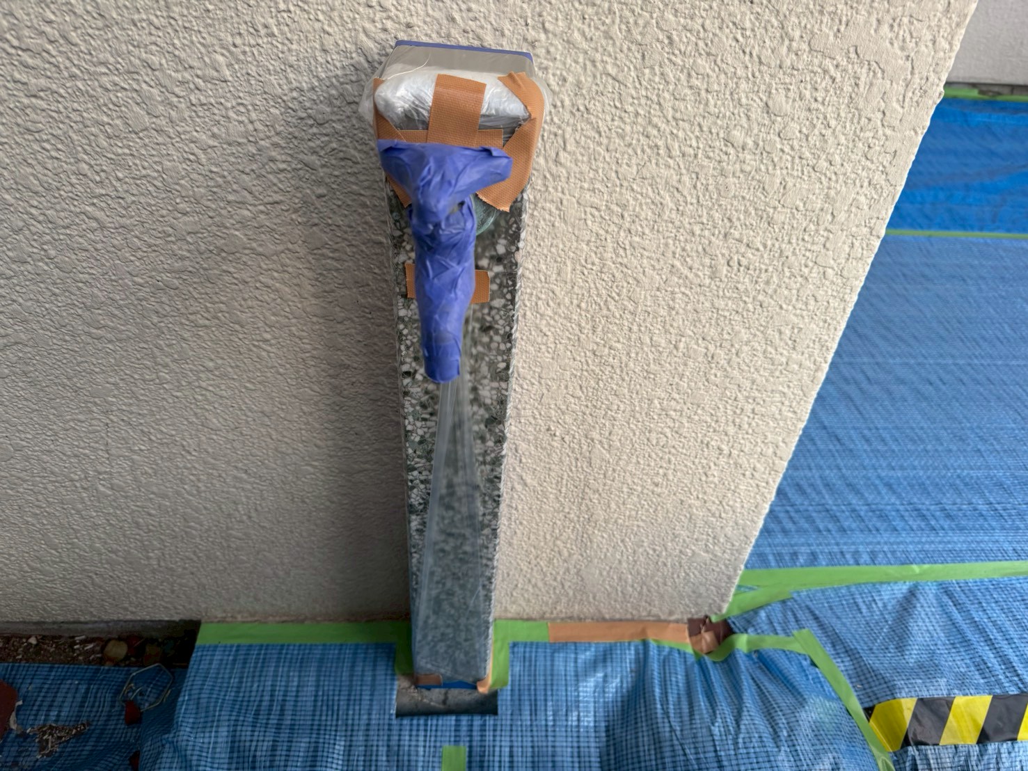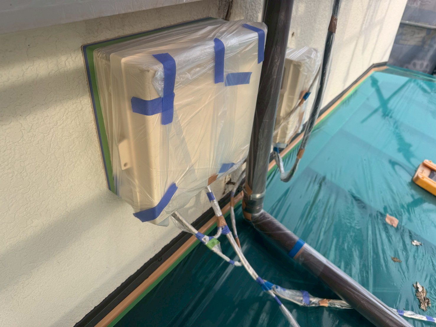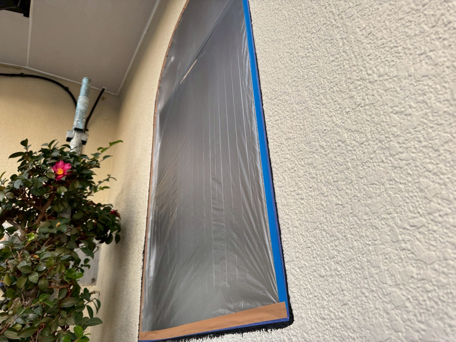 窓、玄関ドア、エアコン室外機、植物、物置、配線関係などの塗装をしない箇所に養生をおこない、塗料が付着するのを防ぐことを目的としております。