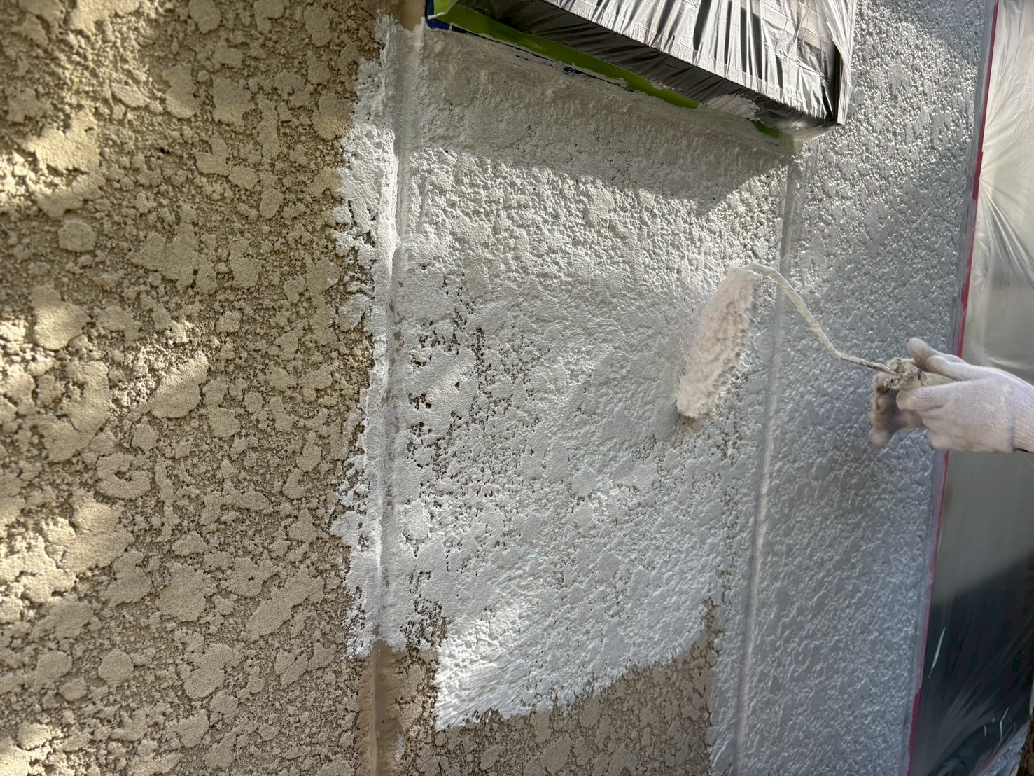 外壁の小さなひび割れや凹凸、傷などを下塗りにより埋めて下地を整える効果がございます。