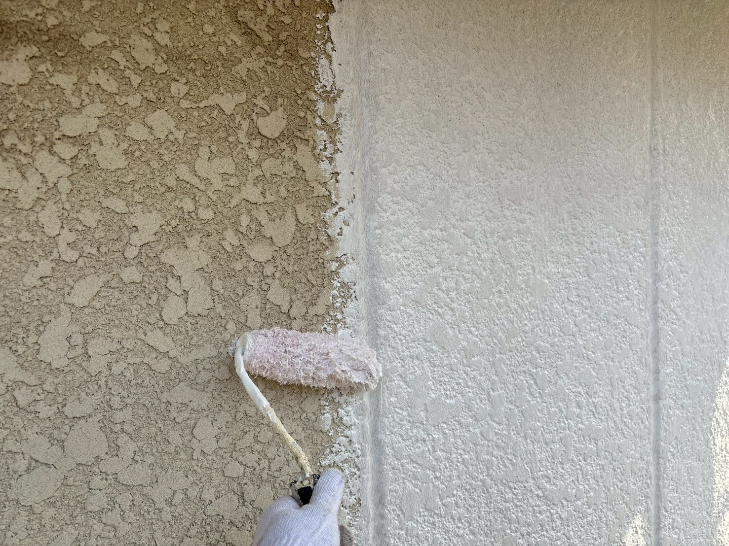 外壁の小さなひび割れや凹凸、傷などを下塗りにより埋めて下地を平滑にする効果があります。