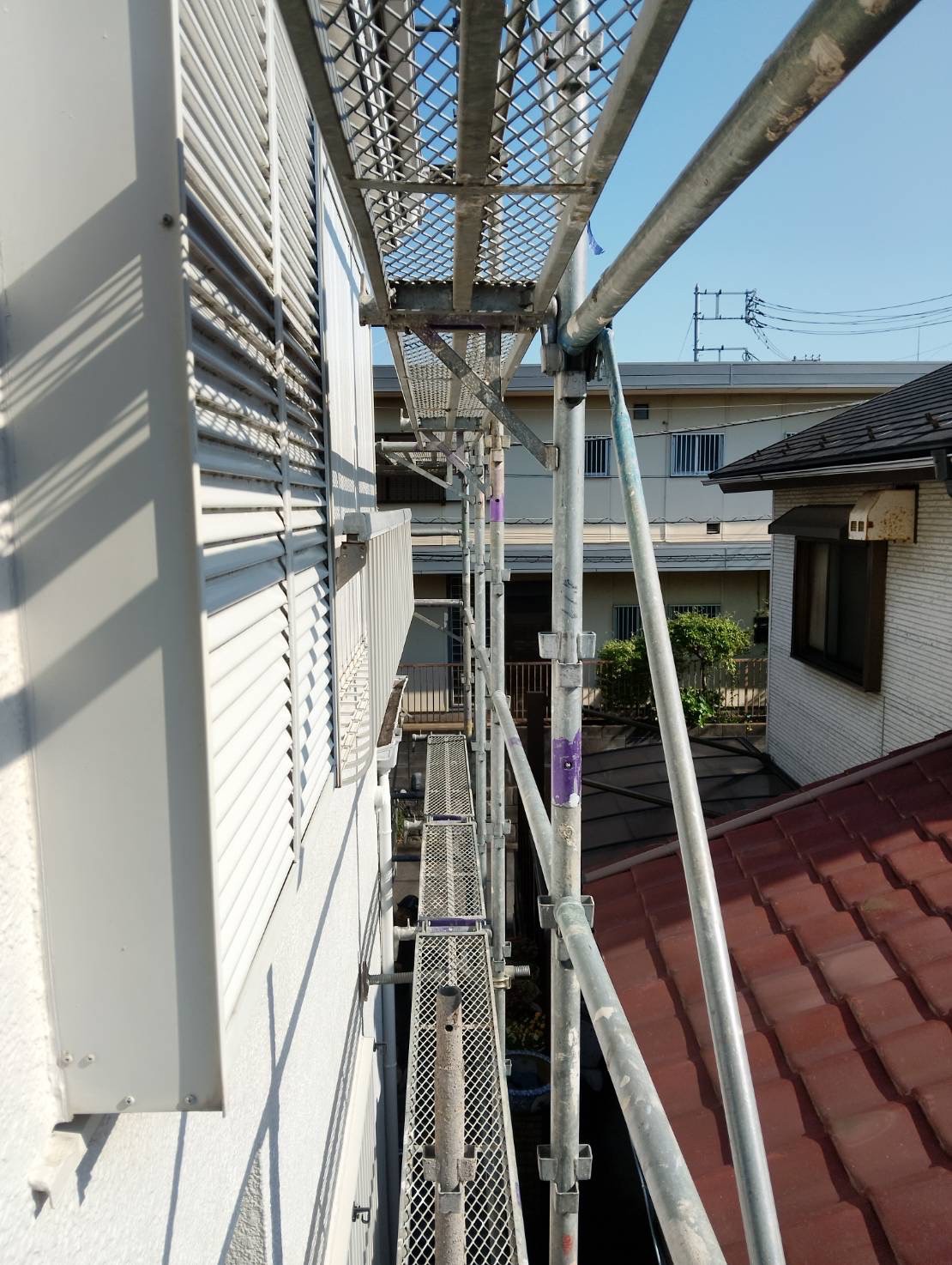 足場とは、外壁塗装や屋根工事などを施工するにあたり、高所作業を安全且つ効率的におこなう為の建物の周囲に設置する構造物となります。