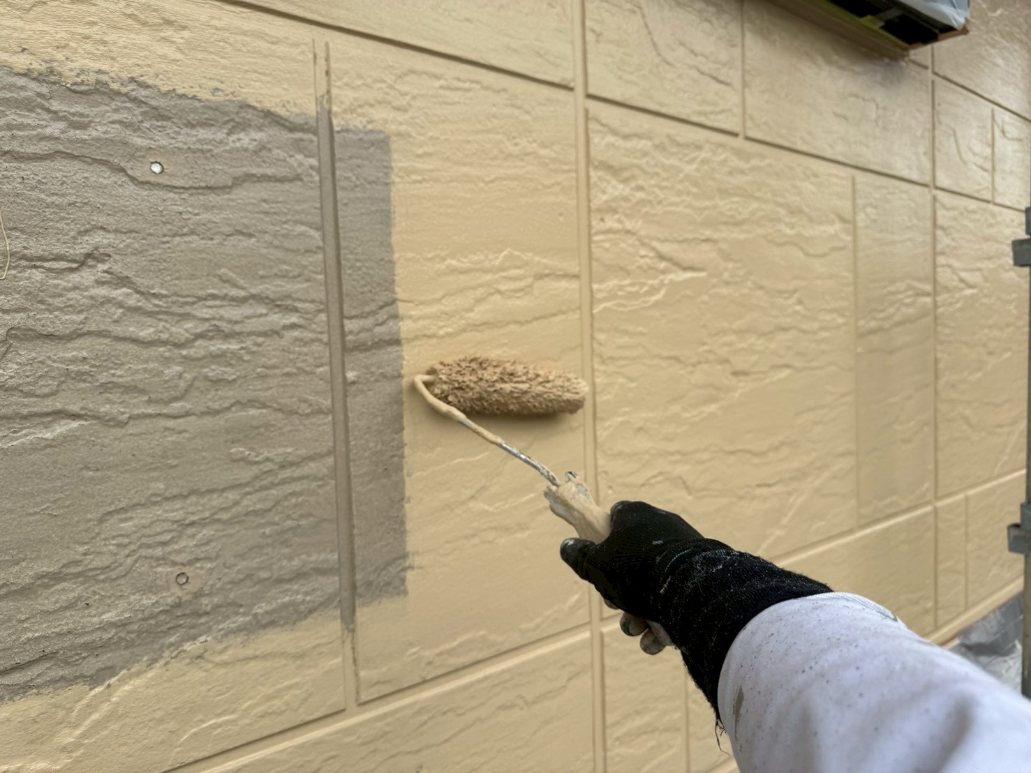 既存色と同系色ですが、既存外壁の劣化も目立ちましたので色が入る事により更に綺麗になっていくのが楽しみです!!