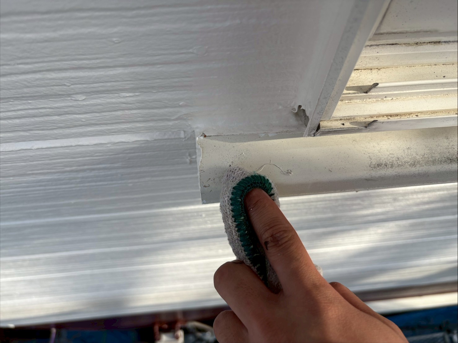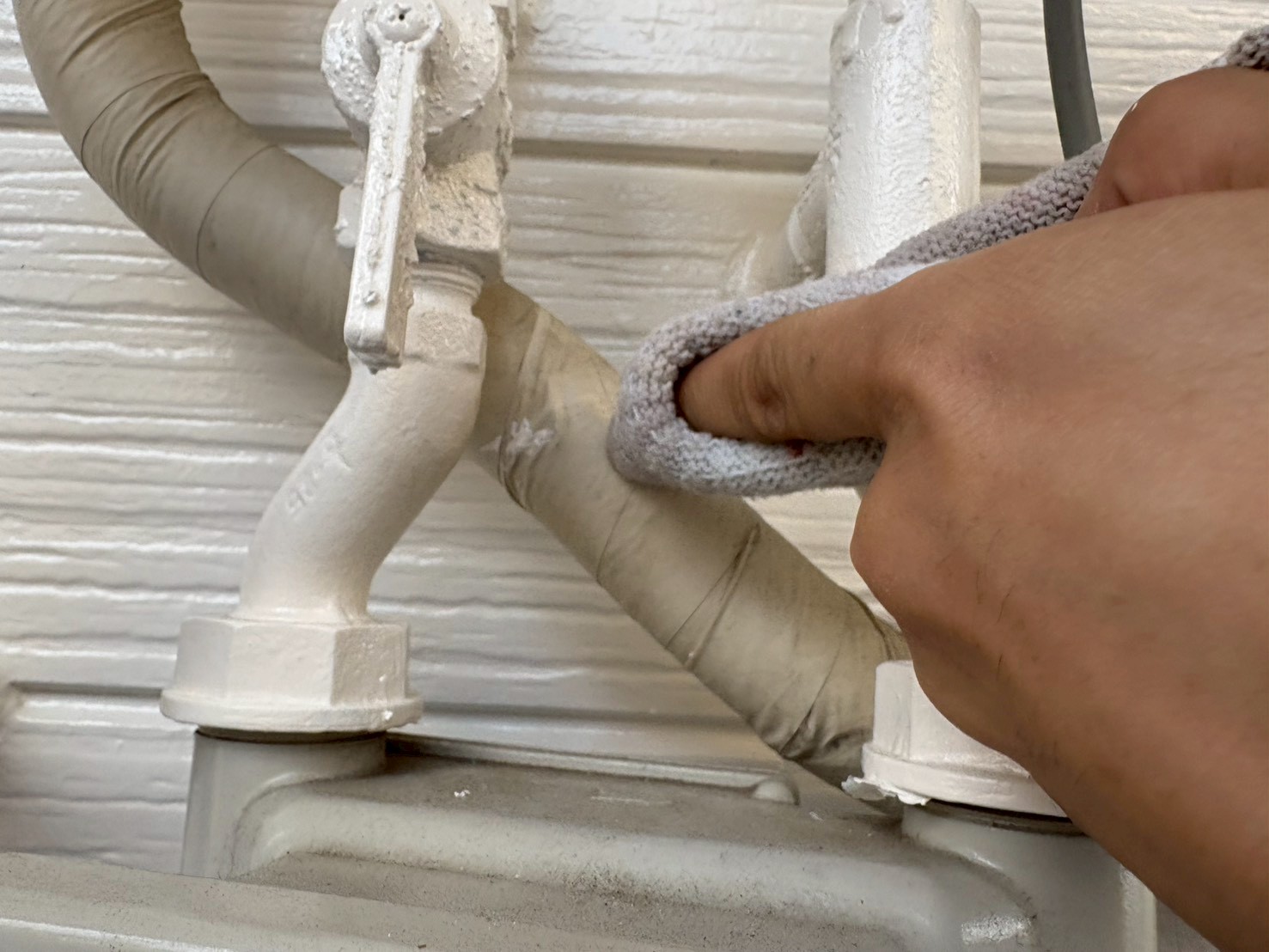 窓枠や給湯器、付帯部などの裏側などを塗り忘れてないかなどを、重点的にチェックします。養生を剥がした箇所に汚れ(ノリ跡)などがないかも確認します。